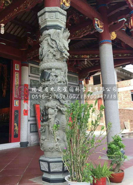 青石龍柱自清代以后大量出現(xiàn),因青石“韌”,宜精雕細刻。若按鏤雕深淺計算,具體可分為蟠龍柱、人物柱、花幕柱、八仙柱等;龍柱則又有淺浮雕與高浮雕之別,“白龍”柱基本是淺浮雕,而“青龍”基本是透析度極高的高浮雕。在龍的數(shù)量上區(qū)分,有單龍的盤繞柱,雙龍戲珠的柱子。而最為別致的是,“福龍”系列中聚成了閩南石雕龍柱的靈魂、寄托閩南人民的希望的“翻天覆地龍柱”。此外,可以按石柱本身的形狀分為方柱、八棱柱、六棱柱等等。
