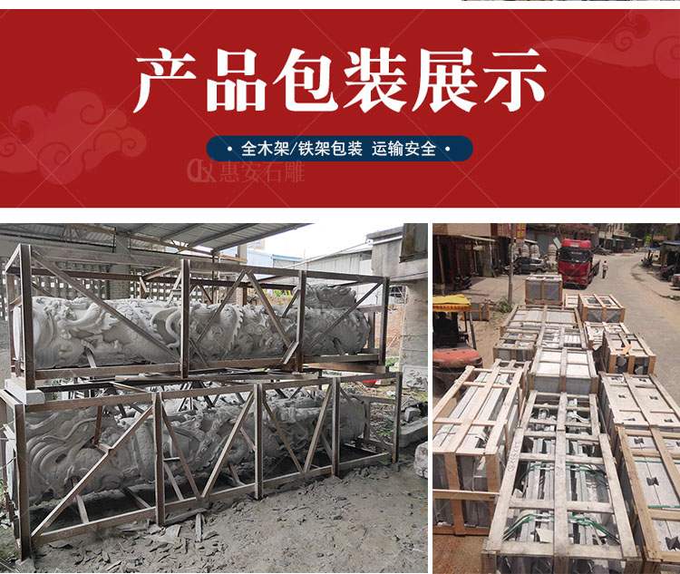 福建廠石雕龍柱產品構成為柱礎、柱身、柱頭(柱帽)三部分,龍柱一般為圓柱形,通身雕刻有纏柱云龍,適用于宮觀寺院、宗祠古厝、園林景觀、廣場擺件等,常用石料為花崗巖與青石。